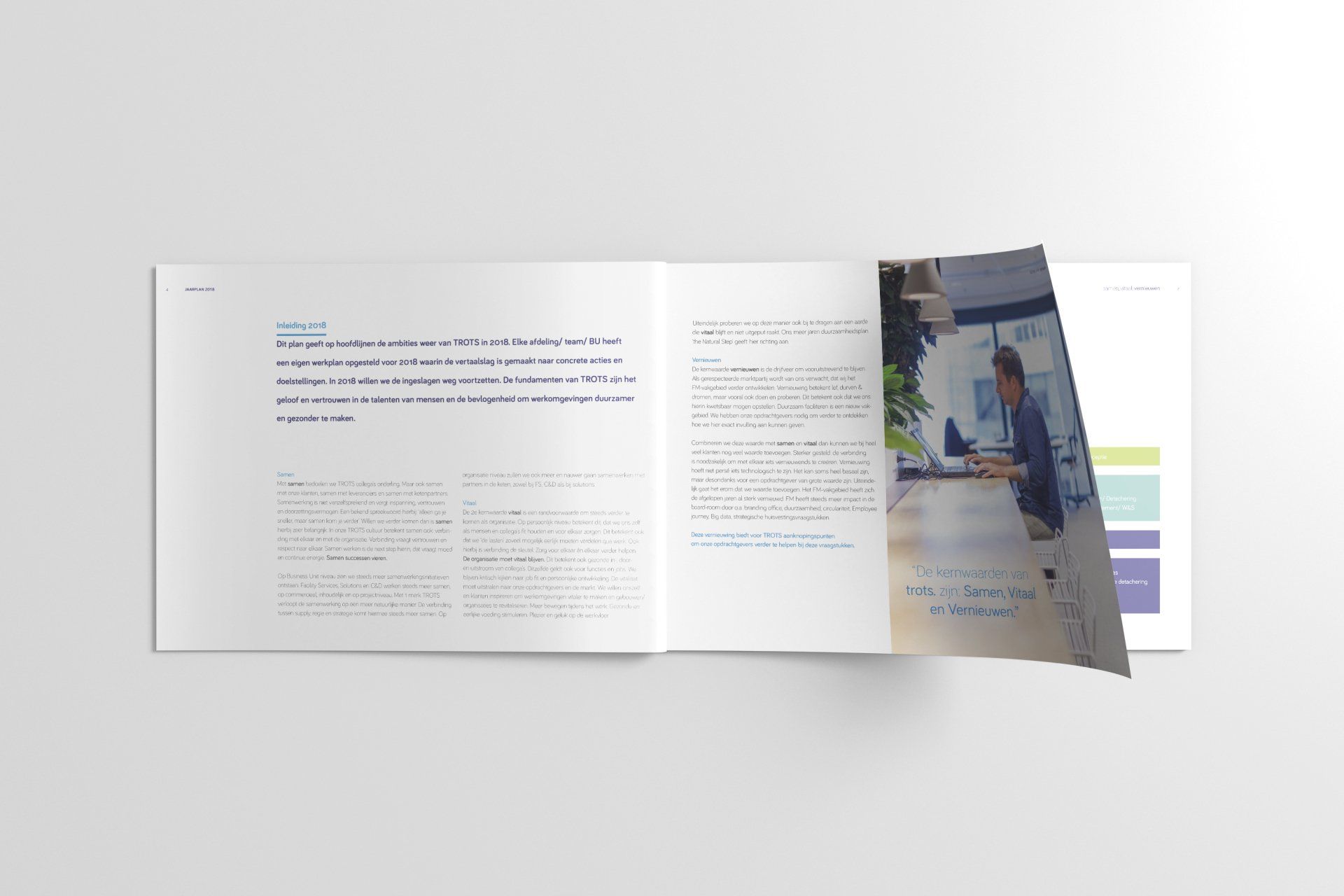 Na interne sessies hebben wij een analyse gemaakt van de vraagstelling/behoefte. Hieruit is gebleken dat TFM, iNFacilities, Newfacts en FacilityMatch zich beter en sterker konden positioneren onder één krachtige naam. Vanuit die visie is gewerkt aan een concept-/merknaamontwikkeling. Dit heeft vanuit het hart geleid tot één merk: TROTS. met de payoff: duurzaam faciliteren. Met als klap op de vuurpijl het .nl domein! trots.nl